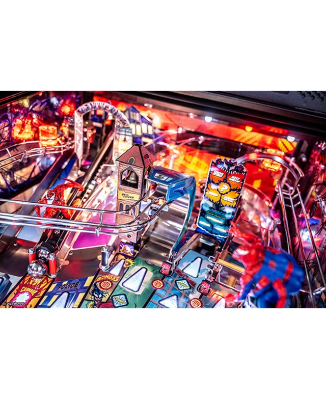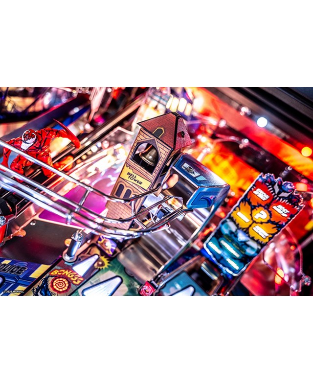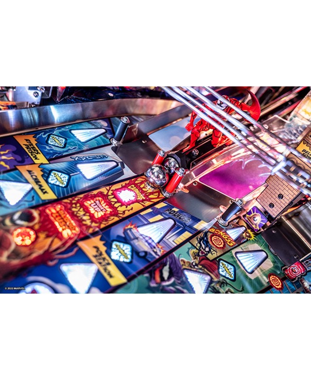 Al encarnar a Venom, los jugadores eligen un huésped con el que se vinculan al comienzo de cada partida, lo que influye en todos los aspectos del juego, tanto física como digitalmente. Torres verticales de confinamiento de simbiontes situadas a ambos lados del campo retienen y liberan rápidamente las bolas para una interacción frenética constante, mientras los jugadores realizan disparos a lo largo de las trayectorias mecánicamente cambiantes del Agro-Lab y la Fundación por la Vida. Los jugadores podrán golpear una bola interactiva de Carnage —esculpida a medida— para enviarla de vuelta al Instituto Ravencroft de alienados criminales. Además, un ataque sorpresa de Doppelganger puede activarse en cualquier momento, desplegando tres objetivos que se elevan y causan caos.